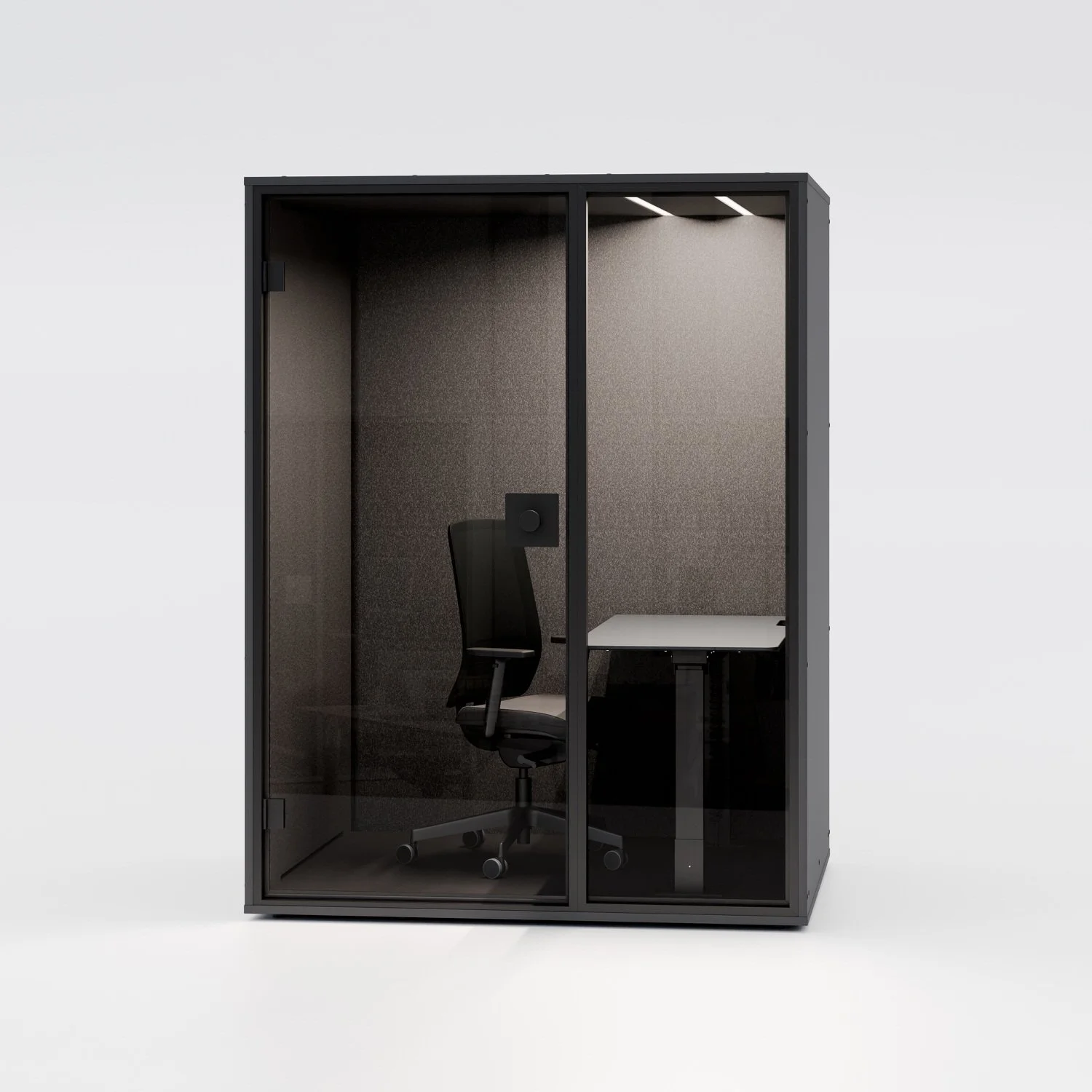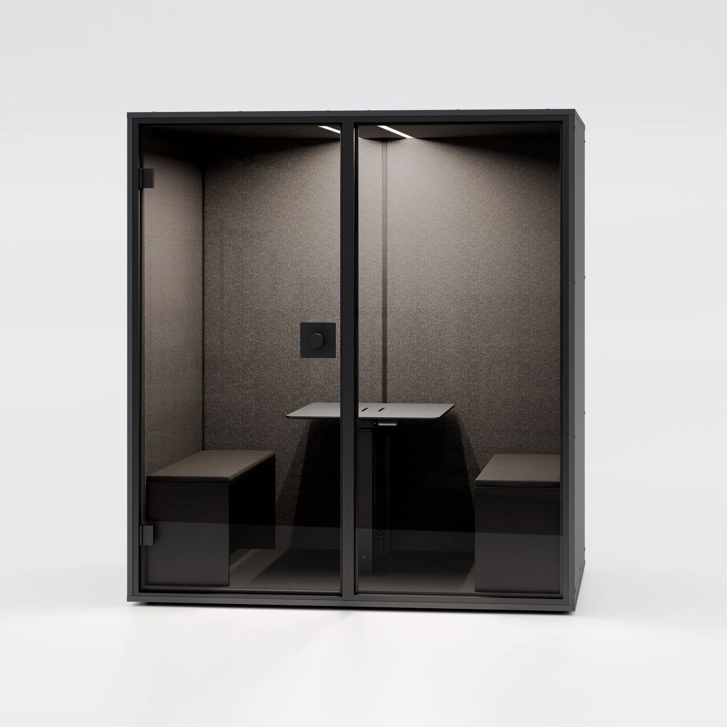 Die Meetingbox ist vollumfänglich ausgestattet mit Stromanschlüssen, LED-Beleuchtung, Lüftung und natürlich einem ganzheitlich schallisolierten System.