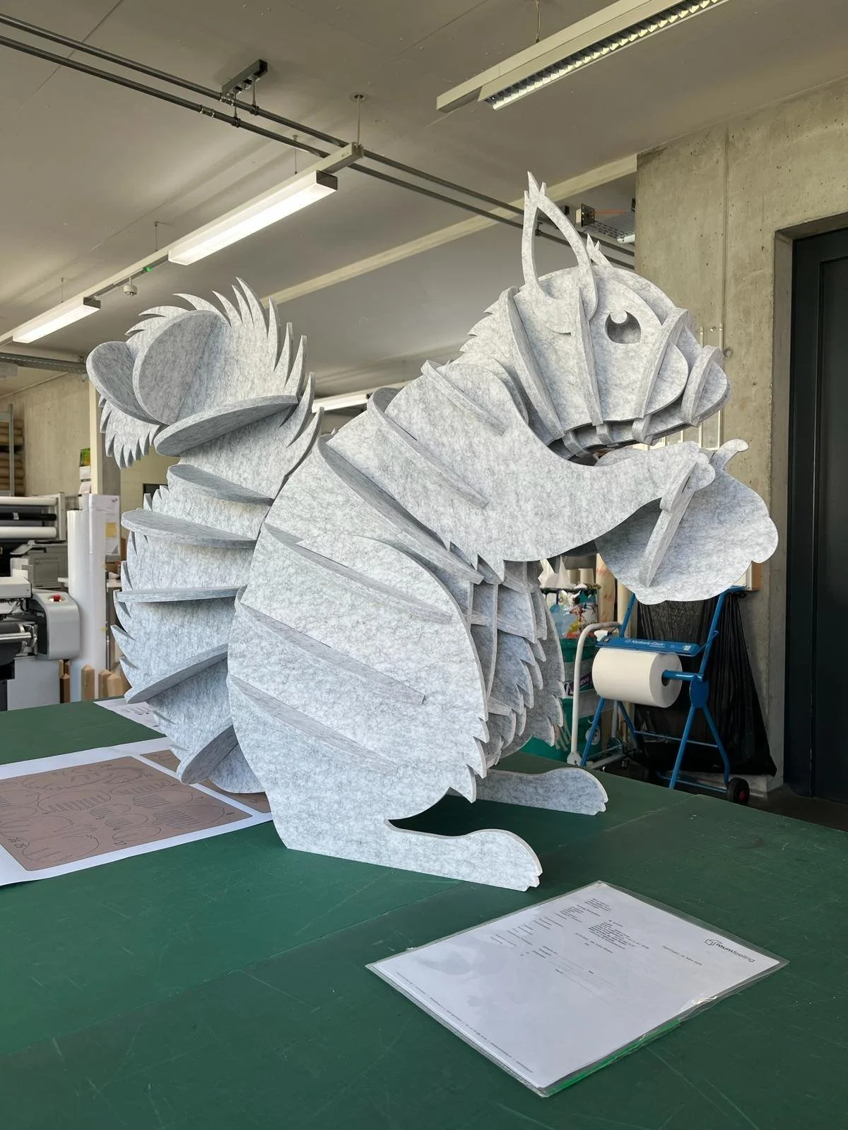 Als alles vorbereitet war, begannen wir damit, die PET-Akustikplatten zu fräsen und sie anschliessend gemäss dem Schnittplan zusammenzusetzen. Dies war ein aufregender Moment, in dem das Eichhörnchen langsam Form annahm und zum Leben erwachte.